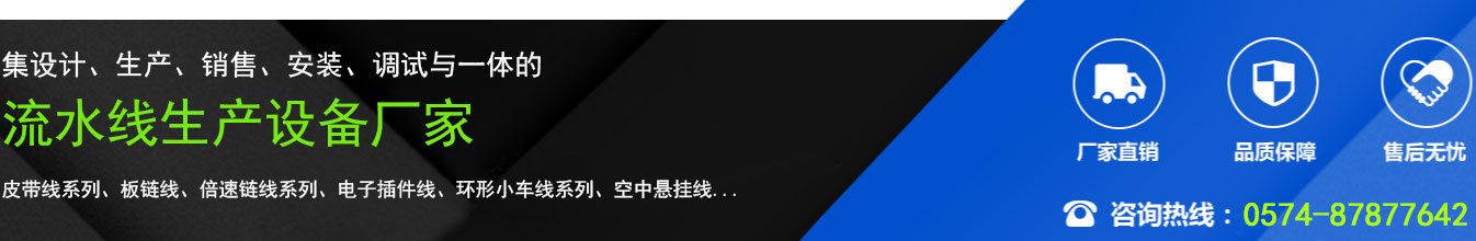 是一家集開發、設計生產、營銷、安裝、調試與一體的寧波流水線生產廠家。產品有:皮帶線系列、板鏈線、倍速鏈線系列、電子插件線、環形小車線系列、空中懸掛線、動力滾筒線、無動力滾筒線系列、皮帶線彎道、無動力裝配工作臺以及各種非標配套設備.